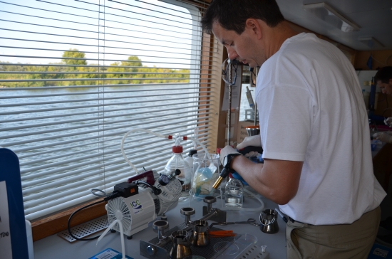 While the teams in their boats are executing their job, thousands of liters of river water are being pumped on the Argus through the special devices to collect the suspended particulate material which will be analyzed later for hazardous substances and also to trap by various sorbents the chemical substances occurring in the water to be able to detect even the extremely small amounts of any toxic pollutants that might be harmful to the humans or biota.
