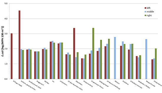 Data on E.coli contamination at different sampling sites along the course of JDS3 is showing interesting details.